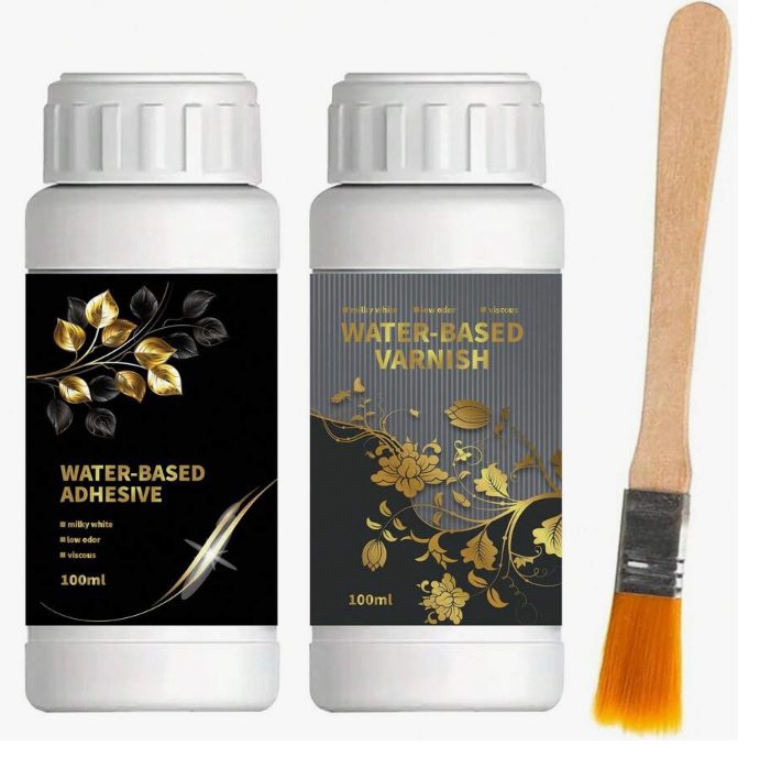 Komplekt liimi ja lakiga kuldamislehtedele. Komplektis on veebaasil kuldamislehtede liim 100 ml ja veebaasil lakk 100 ml. Komplektis on lisaks ka pintsel pealekandmiseks. Kanna õhuke kiht liimi pinnale, lase kuivada umbes 10-15 minutit, kuni on kleepuv. Kanna peale kuldamislehed. Lase kuivada. Kuivamiseks kulub tavaliselt tunde. Pühi üleliigne kuldamislehtede osa ära. Viimasena kanna peale lakk, et kaitsta kullatud osa ja muuta pind ühtlaseks.
