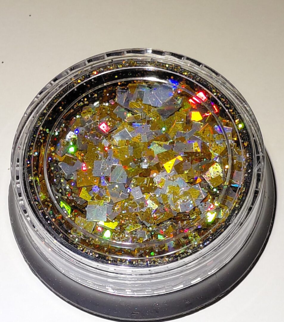 Sädelusega glitterhelbed, erineva suurusega helbed. Helbed on värvuselt: kuldbe-hõbedane-must. Keeratava kaanega topsis.