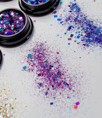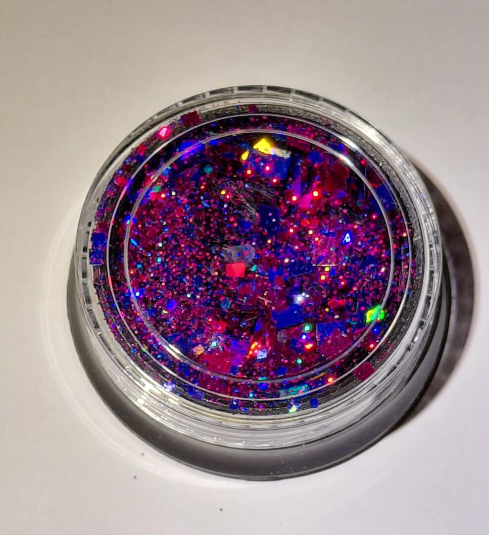 Sädelusega glitterhelbed, erineva suurusega helbed. Helbed on värvuselt tunelilla ja sinisega. Keeratava kaanega topsis.