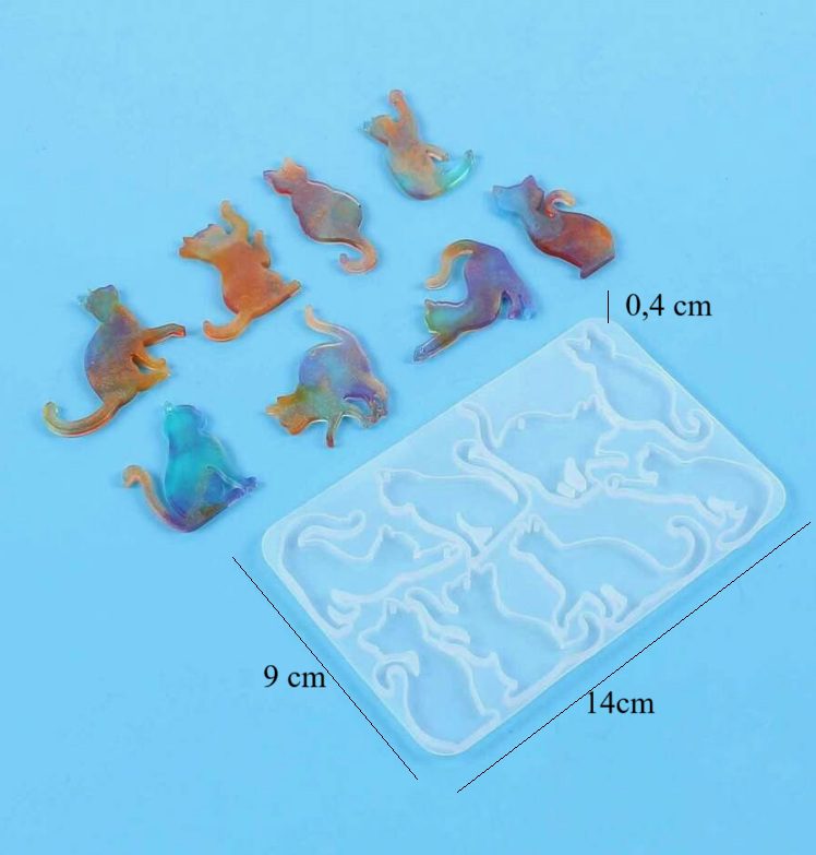 Silikoonvorm kassi kujudega. Silikoonvormi mõõdud on näha fotol. silikoonvormi saab kasutada nt kristallvaigust kassi kujude valmistamiseks. Kassi kujudele jääb koht, kuhu hiljem on võimalik kinnitada rõngas või muu kinniti (jääb auk).
